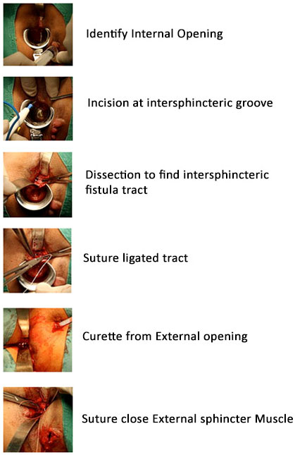 - Dissection through intersphincteric plane to find intersphincteric fistula tract